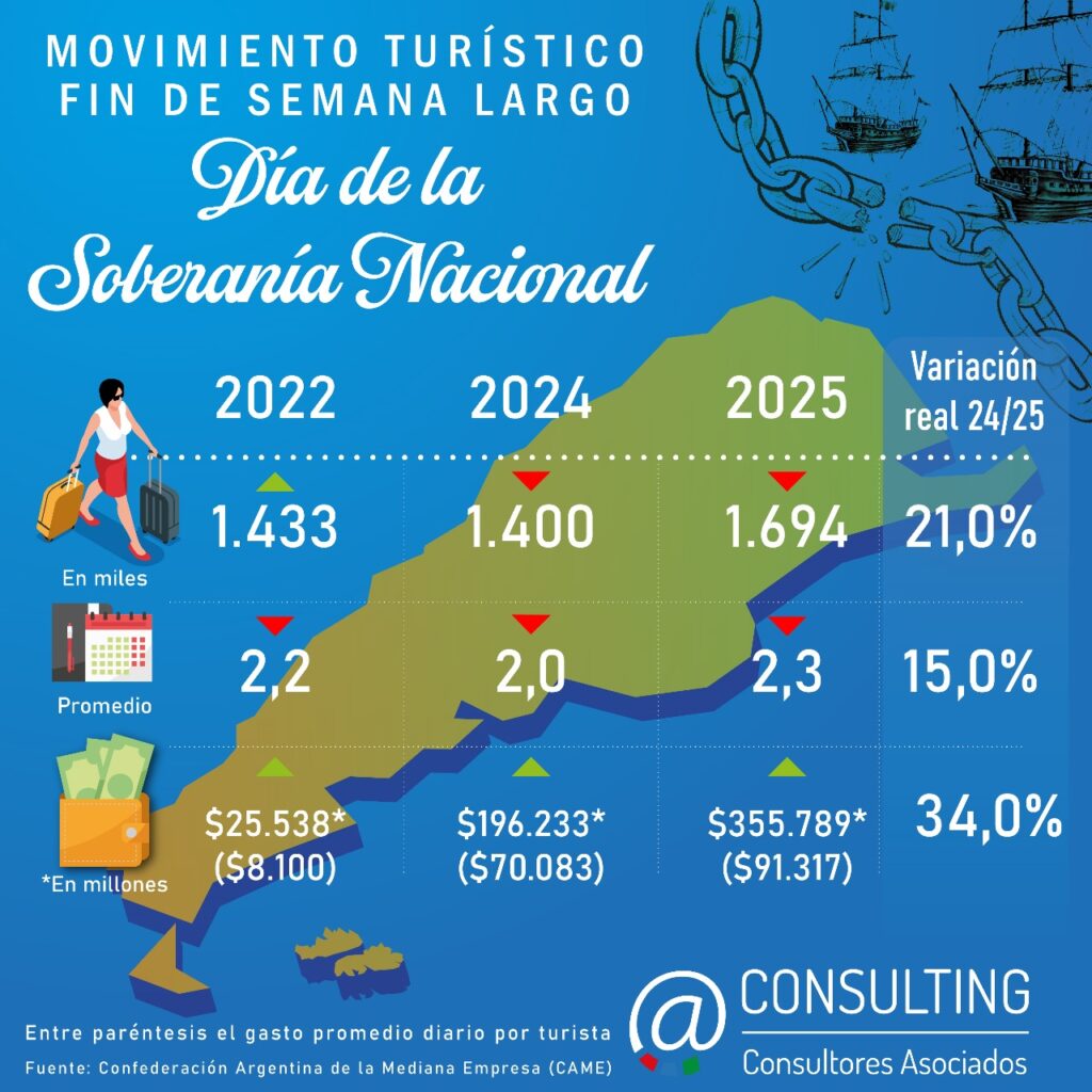 Por Jorge Posdeley. Según datos de la Confederación Argentina de la Mediana Empresa (CAME), durante este fin de semana se movilizaron un total de 1.694.000 turistas, una cifra que representa un 21% más que el mismo feriado del año pasado. Esta mejora es relevante, especialmente si se considera que durante la mayor parte del 2025 el turismo interno creció en volumen, pero cayó en gasto y pernoctación.